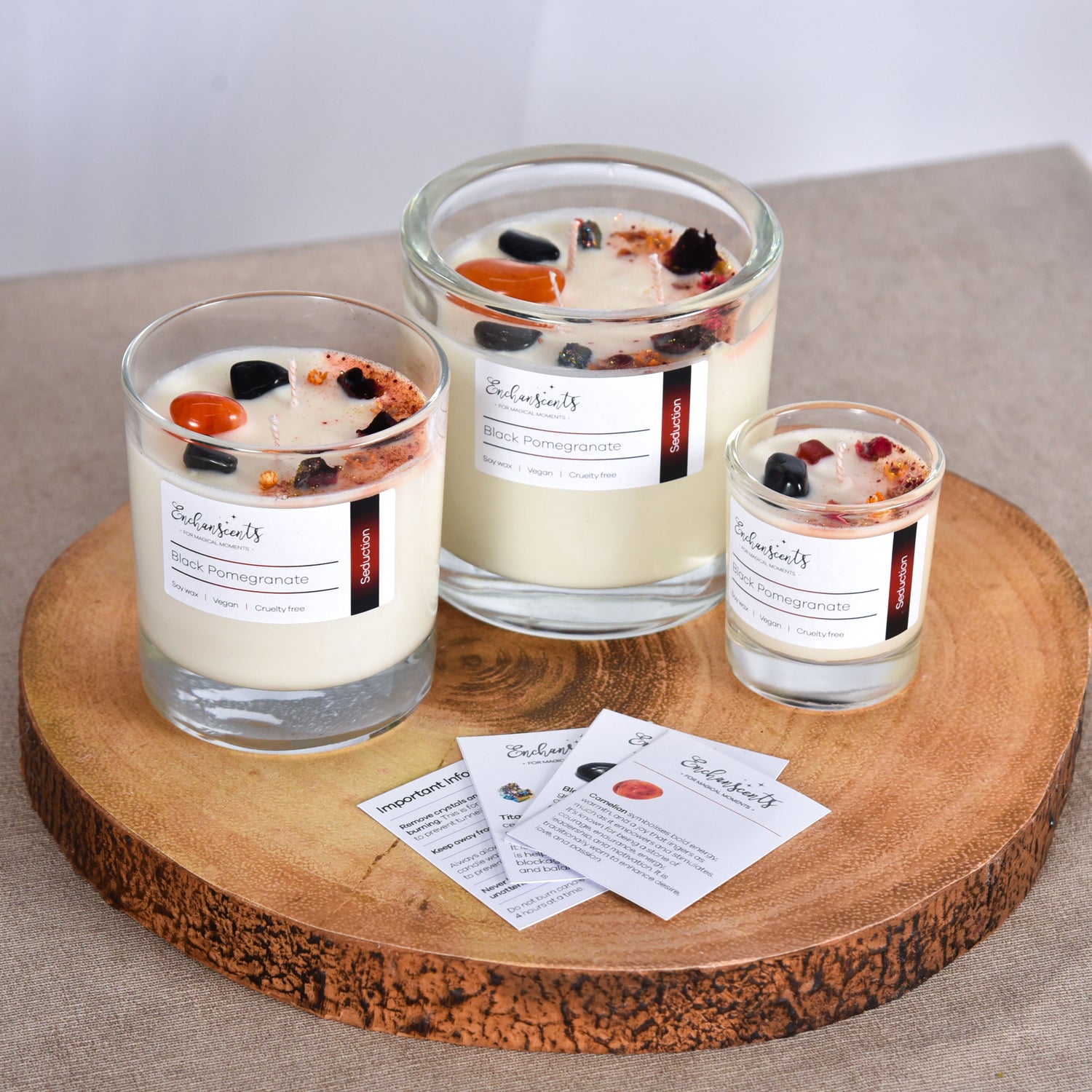 A spicy accord opening with pink pepper, cardamom, armoise, thyme, frankincense, lime and lemon leading into a heart of clove, patchouli and lily with fruity notes of apple, plum and raspberry on a base of amber, tobacco, cedarwood, guaiacwood, cistus and musks. These beautifully scented soy wax candles are infused with crystals and rose petals specially selected for seduction.