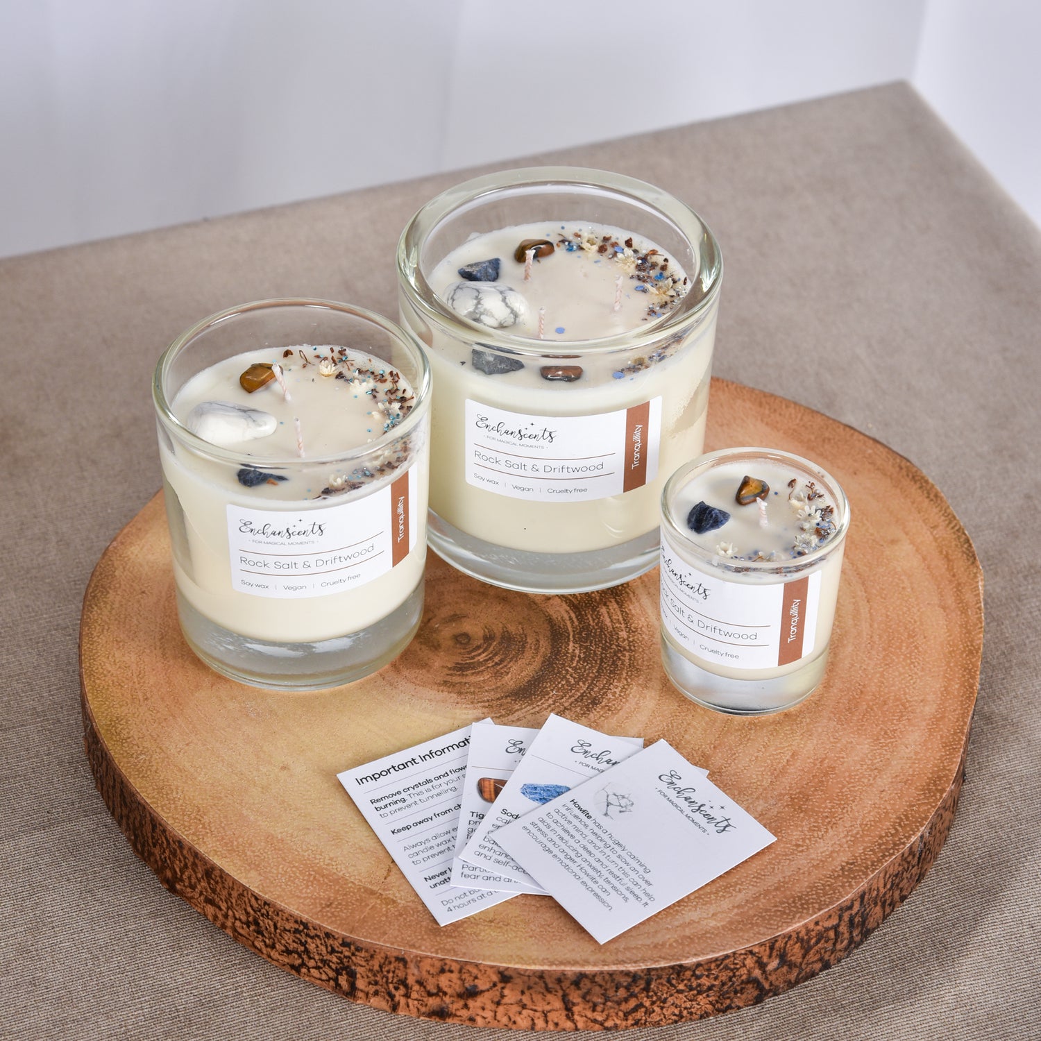 A serene floral marine accord where seaweed and green algae lie in cool rock pools oxygenated by the ebb and flow of the tide whilst the coastal breeze meanders through hardy green florals and aged salt encrusted driftwood. These beautifully scented soy wax candles are infused with crystals selected for tranquility.